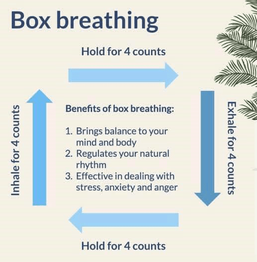 Breathe in for 4 counts, hold for 4 counts, breathe out for 4, hold for another 4 and repeat! It can also be distracting to count in your head or maybe even trace the square with your finger on your palm or leg and focus on the sensation