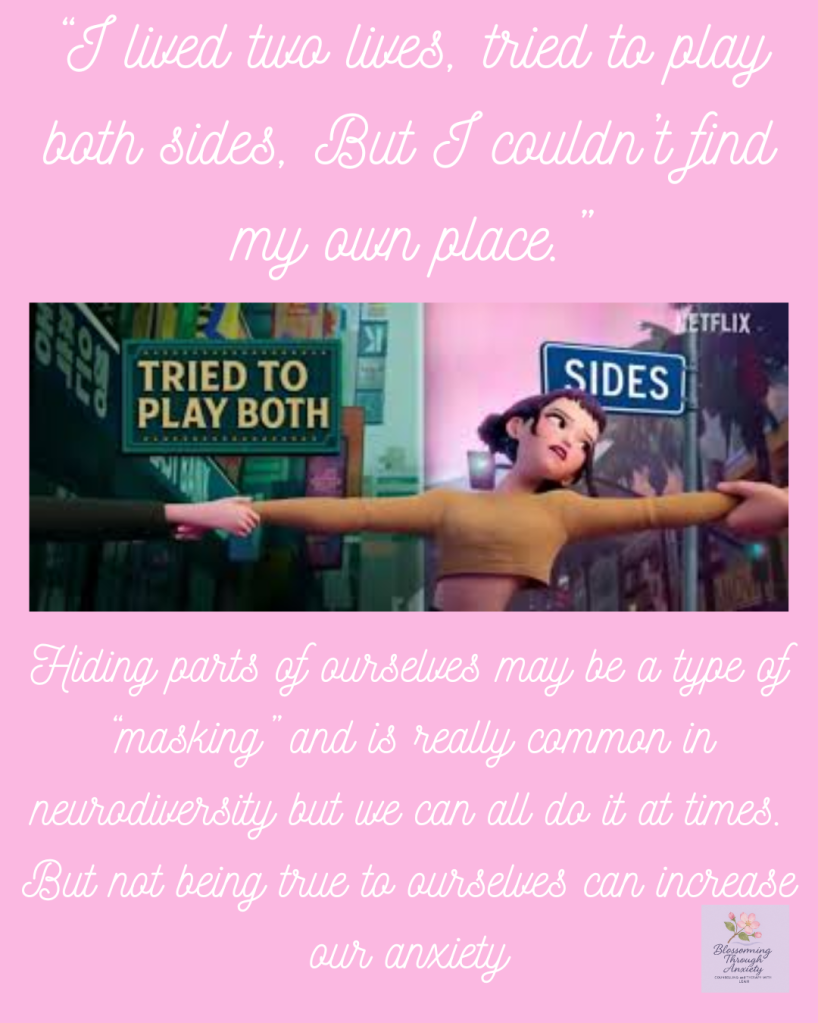 Hiding parts of ourselves may be a type of masking, which is really common in neurodiversity, but we can all do it sometimes. That fake smile that we put on at work, pretending everything is fine. But not being true to ourselves can increase our anxiety and leave us not feeling whole.